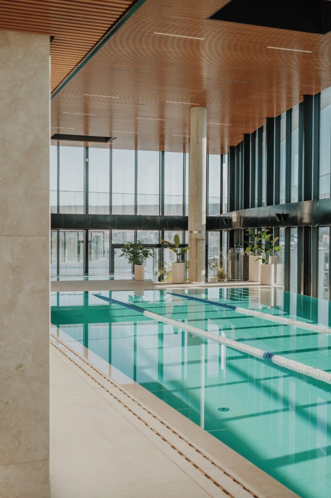 The movement facilities themselves are comprehensive and well-equipped. Life Fitness machines cover all major muscle groups, alongside 26 cardio machines positioned with views toward Gediminas’ Tower. More than 45 group sessions take place each week, offering a range of options that let people choose how they move, depending on their needs and energy levels. A 25-meter swimming pool, saunas, and a jacuzzi complete the experience, allowing physical activity to transition into rest and recovery.