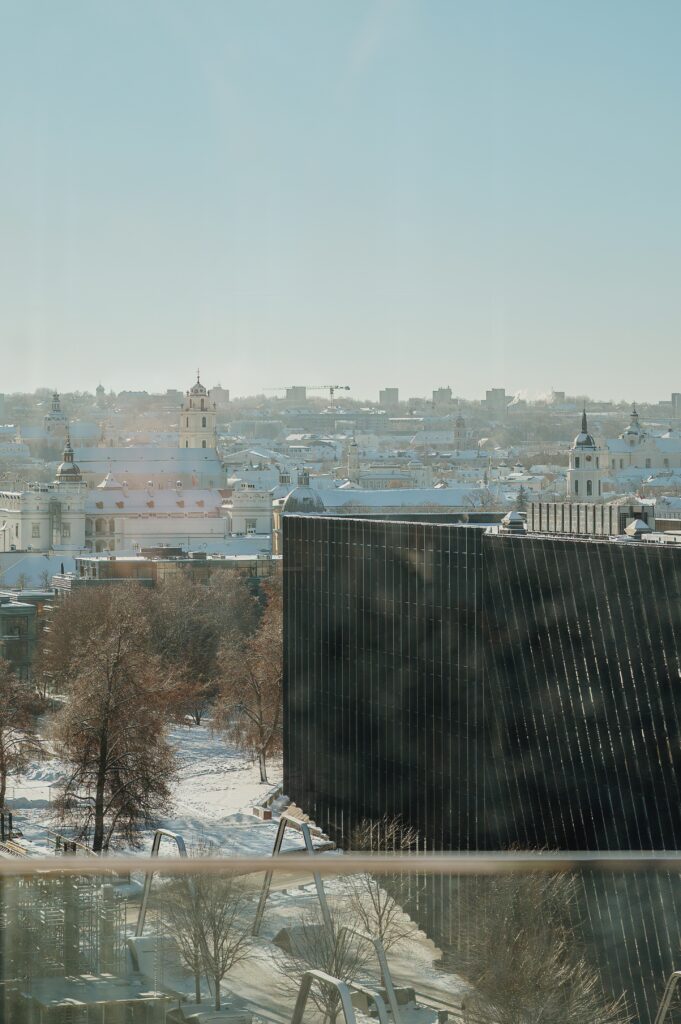 As you move higher into the building, the atmosphere opens up into a bright, modern space designed to slow the pace rather than intensify it. A 360° view over Vilnius naturally shifts perspective, encouraging visitors to pause.