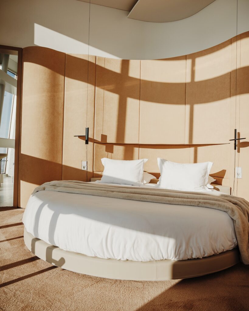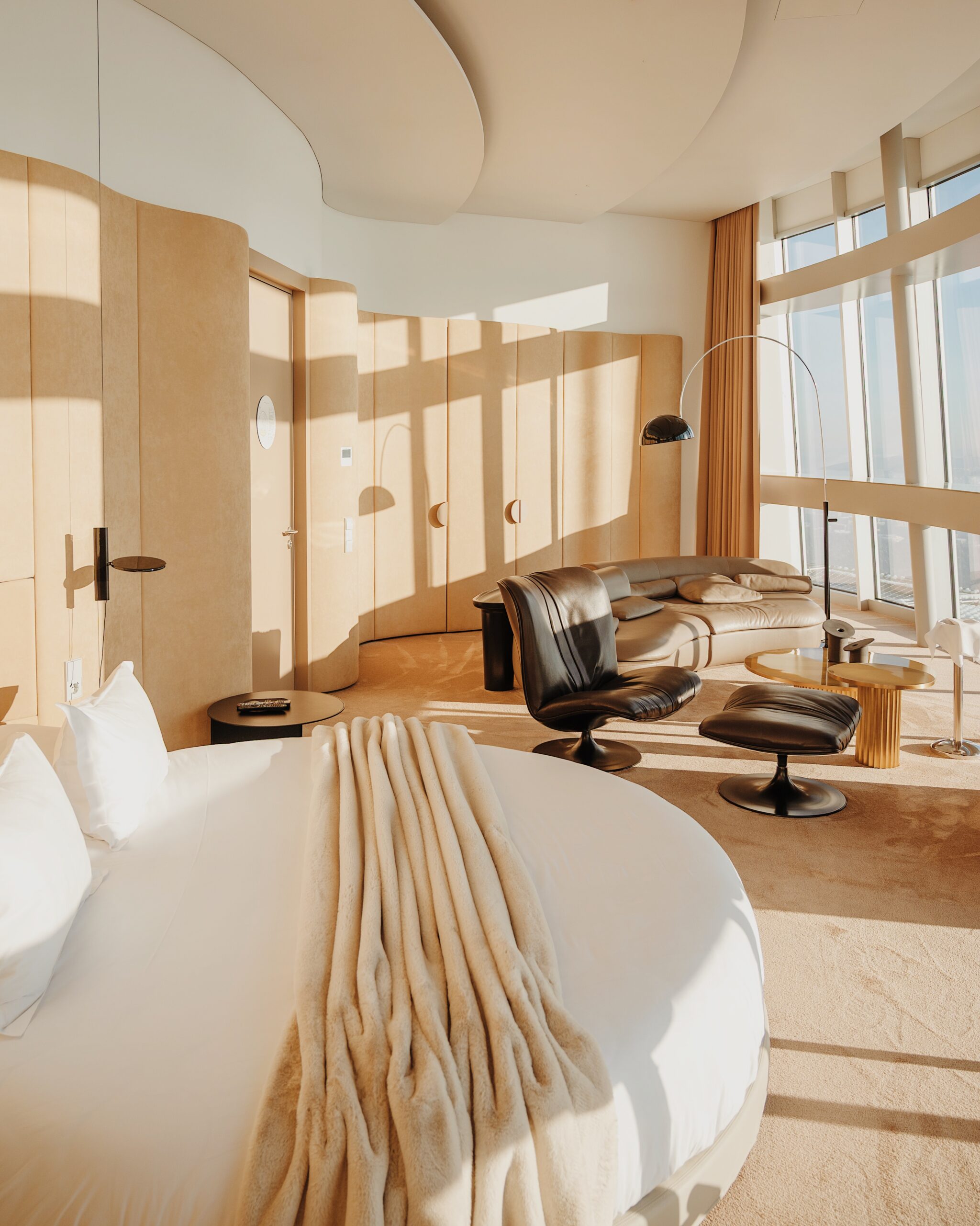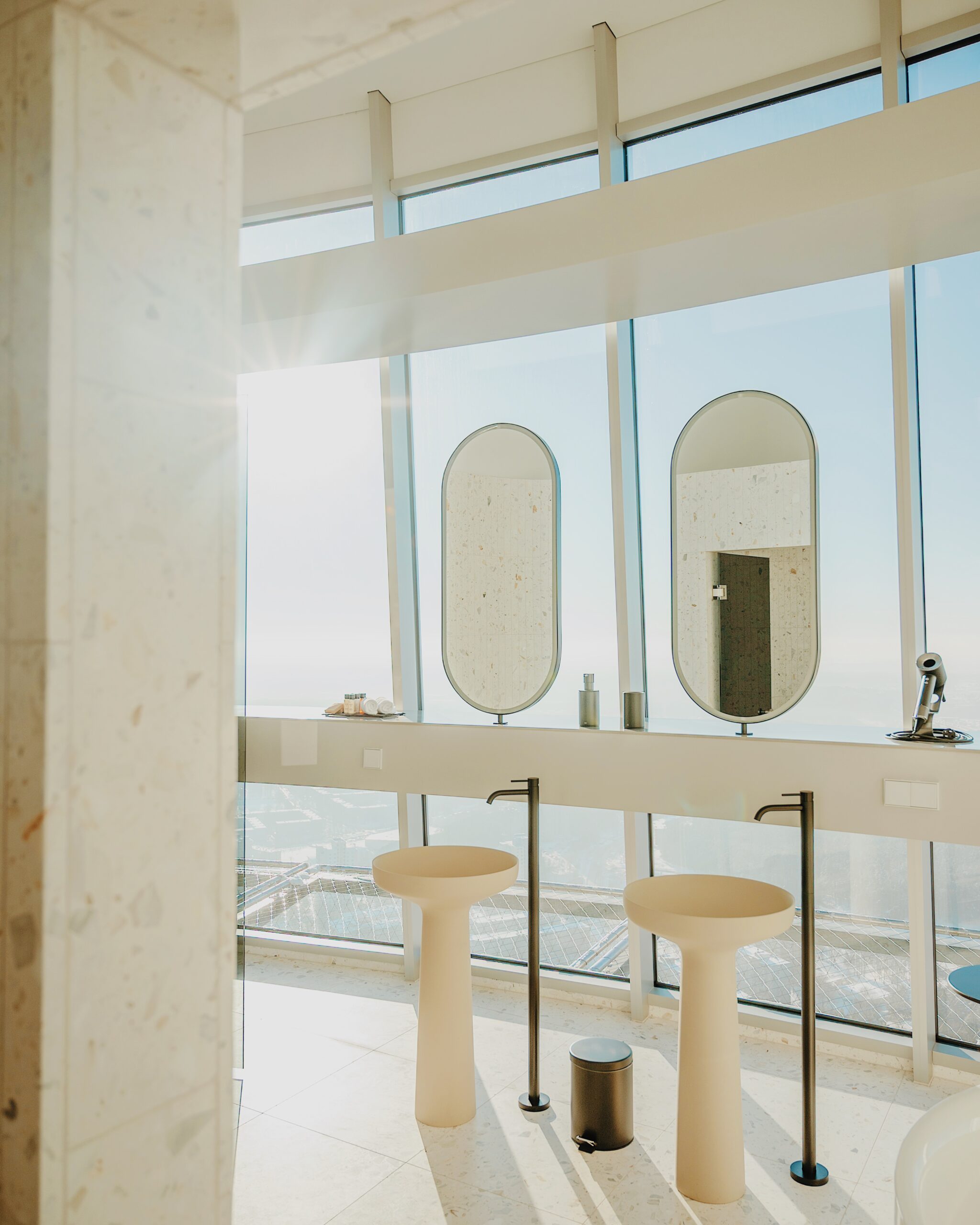 Access to the upper levels is provided by a new high-speed elevator equipped with a video screen. Additional facilities include the DEBESYS meeting room on the 68th floor, located above the bistro-bar, as well as two apartments, UPĖ and MIESTAS. These spaces are designed for small-scale events and meetings, accommodating both work and rest.